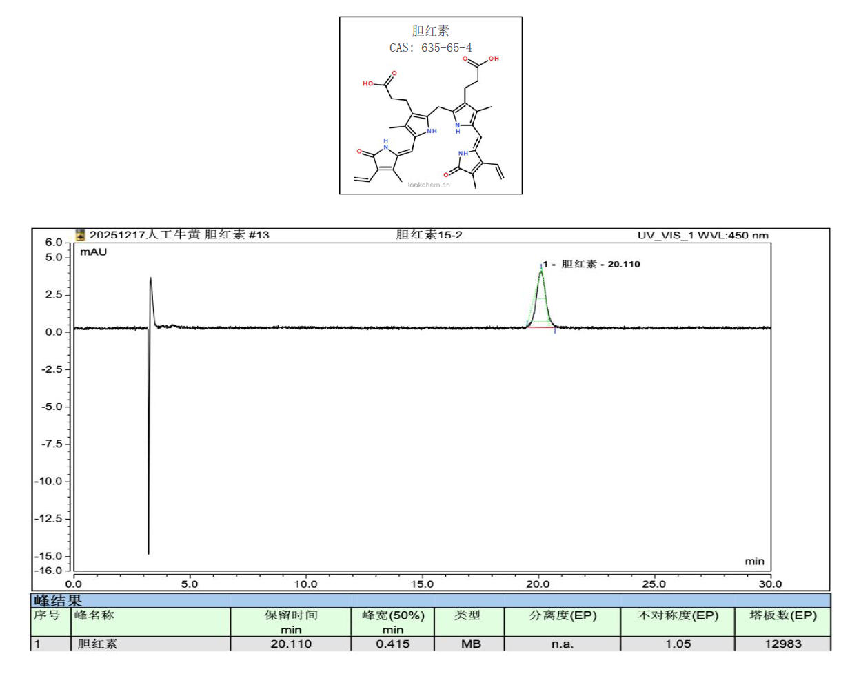 App ID: FLM-T250006 Titank C18 對人工牛黃中膽紅素含量測定 方法:中國藥典2025 一部 色譜柱:Titank C18 5μ 250×4.6mm (貨號:FMG-5560-EONU) 流動相:乙腈:1%冰醋酸溶液=95 : 5 流速:1mL/min 檢測:UV 450nm 溫度:25℃ 樣品濃度:2mg/mL(藥典規(guī)定) 進樣量:5uL 標準品色譜圖: ![]() |